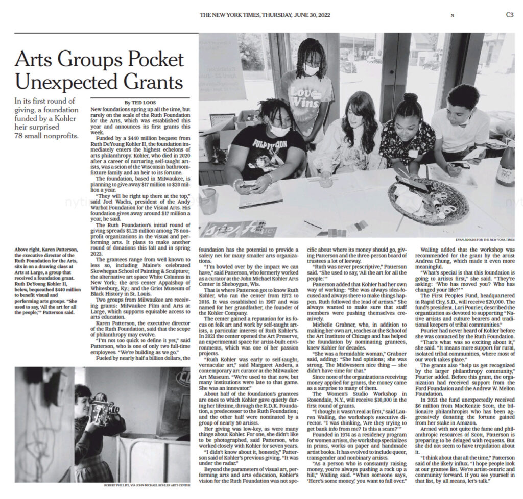 The Milwaukee-based Ruth Foundation of the Arts, established with a $440 million endowment from the late bathroom-fixture heiress Ruth DeYoung Kohler II, has announced its presence with an initial $1.25 million in unrestricted grants to seventy-eight unsuspecting US nonprofit arts organizations. The grantees, each of whom received $10,000, $20,000, or $50,000, were chosen by a diverse panel of nearly fifty artists from around the country representing a variety of practices and career stages. Because the grants are invitation-only, many recipients were shocked to learn they were receiving funding.
