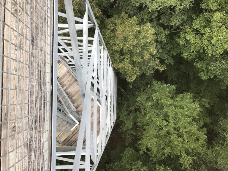 Once you reach the foot of the Perry Lakes Park Birding Tower, though, man, it’s stunning. The open-air stairway climbs to the clouds. Along with a cedar picnic pavilion, modern-designed bathrooms, and a triangular-shaped covered footbridge, the tower is part of a series of projects in the Park completed by 5th-year design-build students from the Rural Studio program through Auburn University. Long known for using reclaimed and unconventional materials in innovative ways, a team of four students purchased a decommissioned fire tower from the state Forestry Commission for $10. Each student had to be trained and certified in tower construction before they began dismantling the 18,000 pounds of steel. Using ropes, pulleys, and grit, they spent 15 days deconstructing and documenting the pieces, followed by 45 days putting them back together with new handrails and viewing platforms.