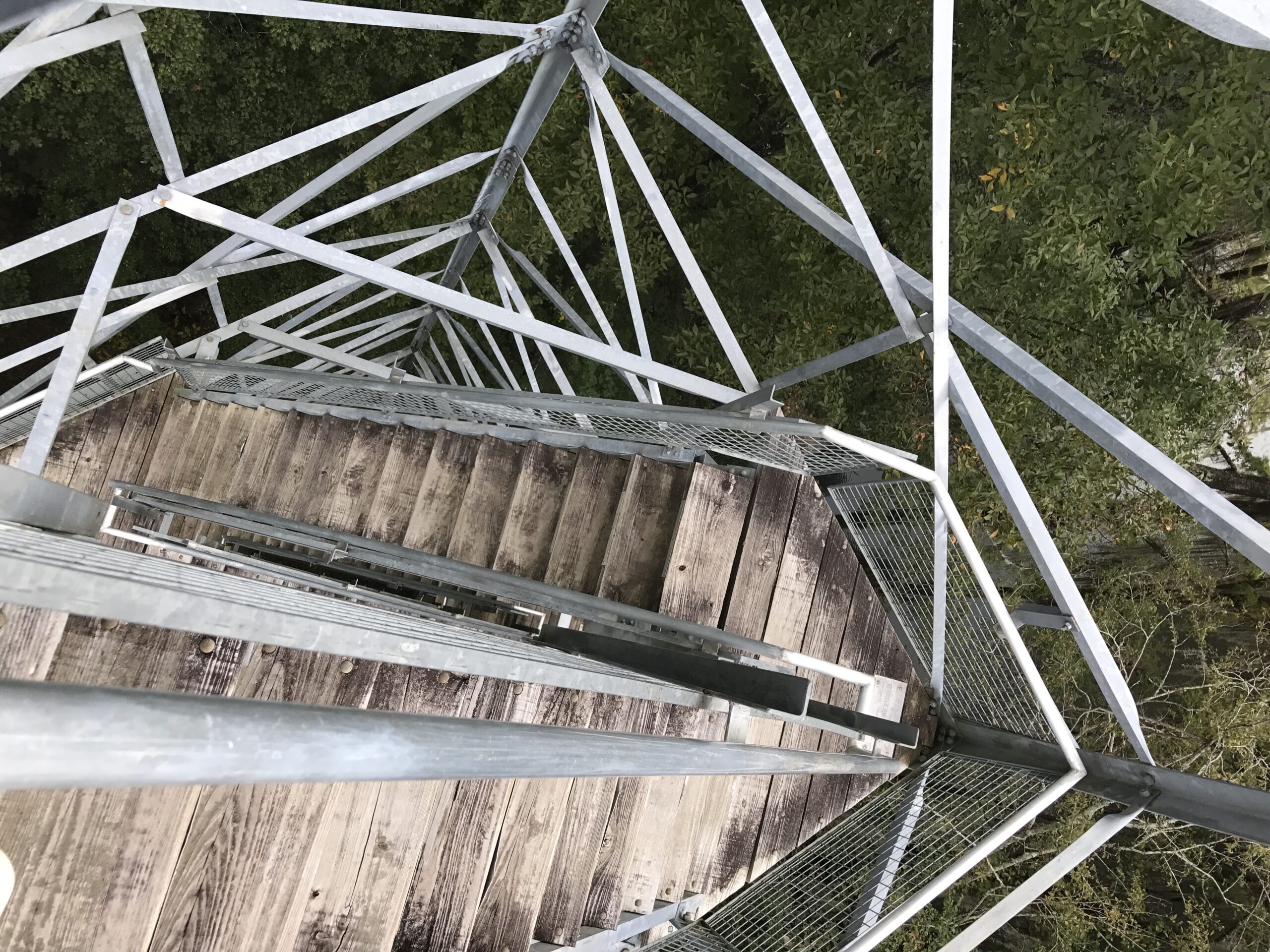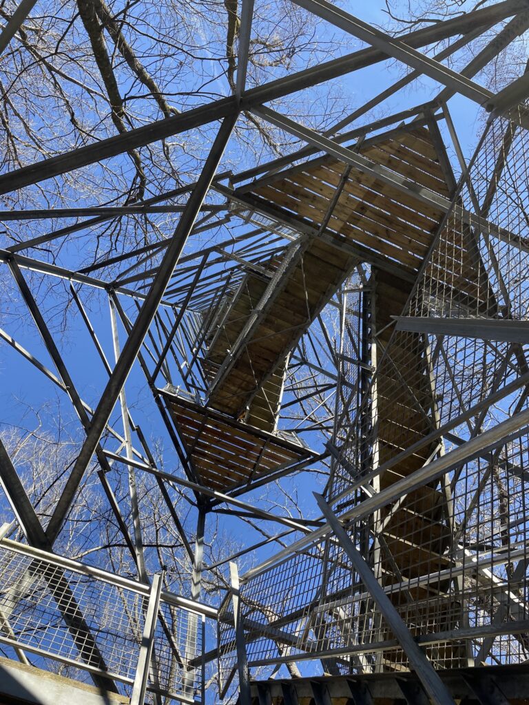 Adrenaline leads the way as you start up the stairwell, the equivalent of a 10-story building; things change quite a bit during the journey to the top. As you climb, the stairwell grows narrower and steeper as you reach each new landing. Zig-zagging upwards, the staircase’s risers start to meet at impossible angles. 2/3rds of the way up, a brisk wind starts rushing around you. A heavy whoosh is the only thing you can hear. The tower is beginning to sway, or it may be a wobble in your knees. At the peak, the students replaced the cab with an open viewing platform with a breathtaking 360-degree vista.