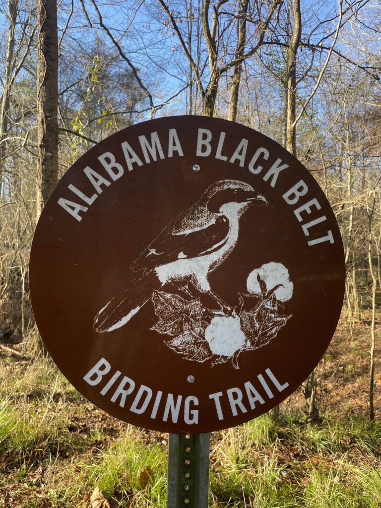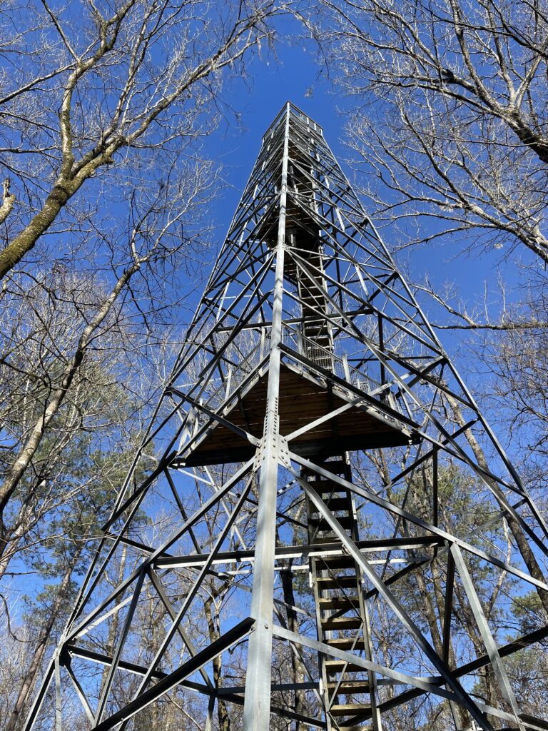 You start on the boardwalk that runs along the edge of the water. Perry Lakes Park contains four oxbow lakes, each formed when the Cahaba River changed course 150 years ago. Walking through the Park’s mature hardwood forests, you face the many tupelos and bald cypresses with their horizontal roots just below the surface and protruding upward from the glassy black water. Despite the Birding Tower’s imposing presence, it can be easy to miss at first through the camouflage of the bluish-gray streamers of Spanish moss floating off the leafless trees.
